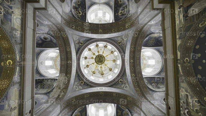Вид изнизу церкви с красиво украшенным потолком. Действие. Интерьер храма, концепция религии
