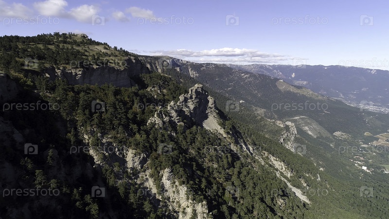 Горы и скалы, покрытые зелеными лесами. сосны на склонах гор с гигантской скалой под ярким солнечным светом