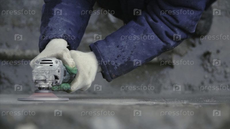 Рабочий-строитель с шлифовальной машиной, режущей отделочную бетонную стену на стройплощадке