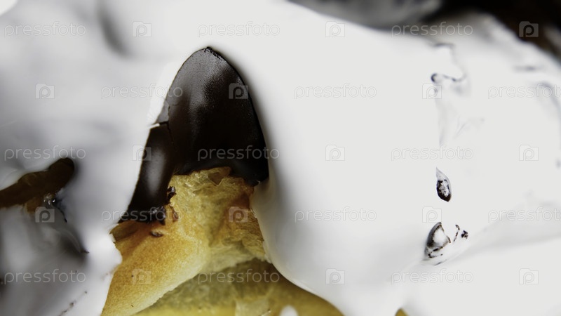 Сладкий десерт с кремом. Запасный клип. Большие сочные шоколадные экляры, которые заливают сахарным белым сливком и удаляют поблизости