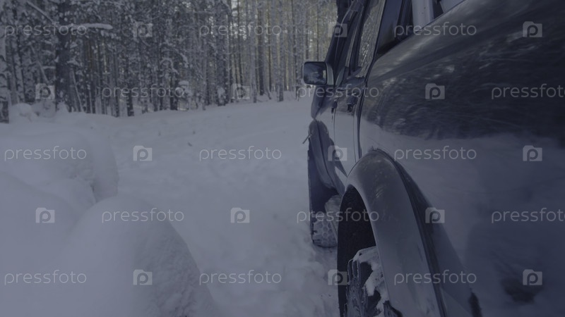 Джип едет по снегу в лесу на крупном плане