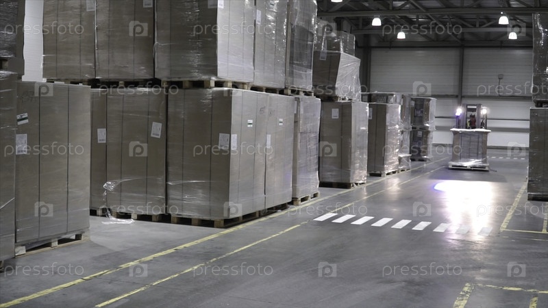 Оптовая логистика, загрузка, перевозки и концепция людей - человек с погрузчиком перевозит грузы на складе