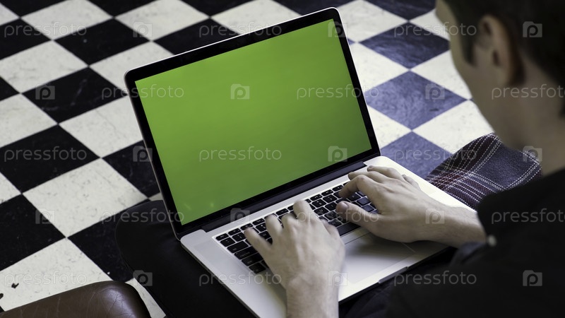 Вид над плечом человека, использующего компьютер с зеленым экраном и сидящего на диване, временной пробел
