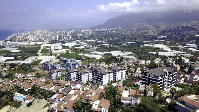 Вид сверху на сельскохозяйственный город у моря. Запасные кадры. Сельскохозяйственные поля со теплицами расположены в городе на побережье голубого моря. Красивый пейзаж южного современного города с сельским хозяйством