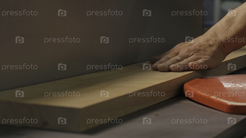 Близкий снимок рабочего, режущего деревянные доски с помощью машины.Креативный. Домашняя машина для разгрузки деревянных досок в мастерской. Человек разрезает древесную доску с помощью станкового инструмента в творческой мастерской