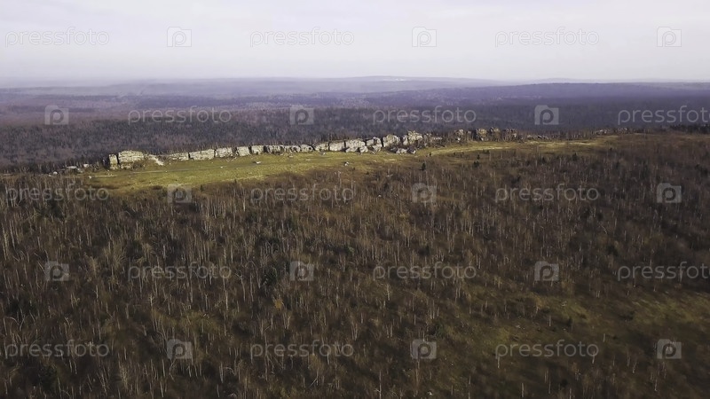 Панорама осеннего голого леса с камнями. Клип. Вид сверху на лесистые осенние холмы с камнями разрушенных гор. Прекрасные осенние пейзажи с деревьями и скалами