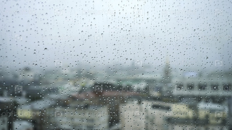 Вид на город через окно и капли дождя, падающие на стекло