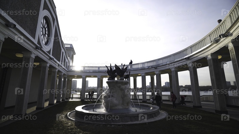 Красивый фонтан на фоне колоннады. Действие. Фонтан внутри колонны на фоне чистое солнечное небо. Прекрасные детали архитектурного здания Северной речной станции в Москве