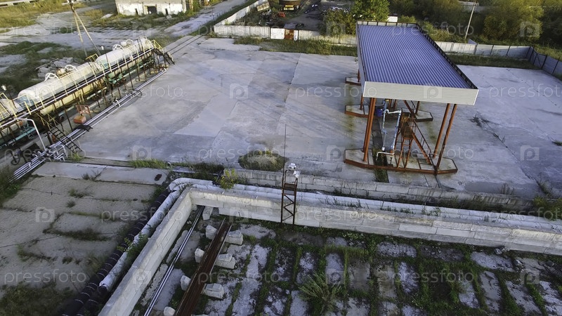 Масляные насосы на нефтяном депо. запас. старая танковая ферма в солнечный день. концепция топливной промышленности