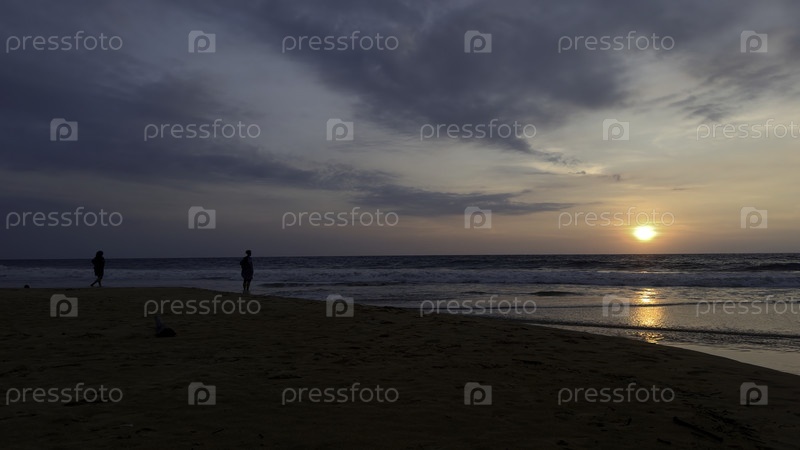 Драматический морской восход солнца на облачном небе. Действие. Волновая песчаная морская обувь и пара, встречающая новый день