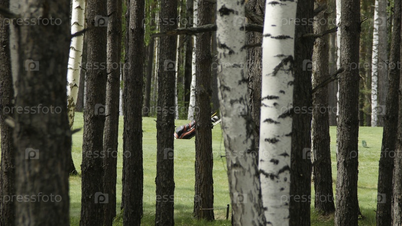Гольф-игроки, гуляющие по фэрвею на поле с сумкой для гольфа и тележкой
