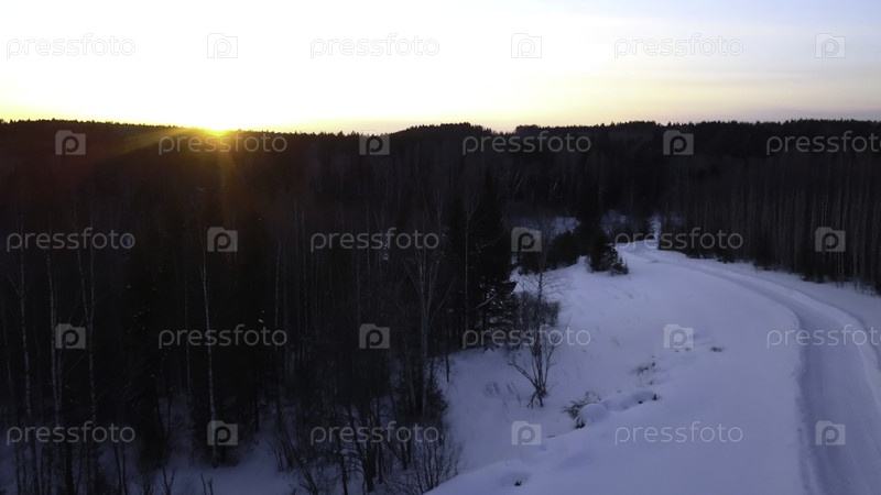 Аэрофотосъемка снегохода, едущего вдоль соснового леса.Клип.Закат солнца и сельская снежная дорога
