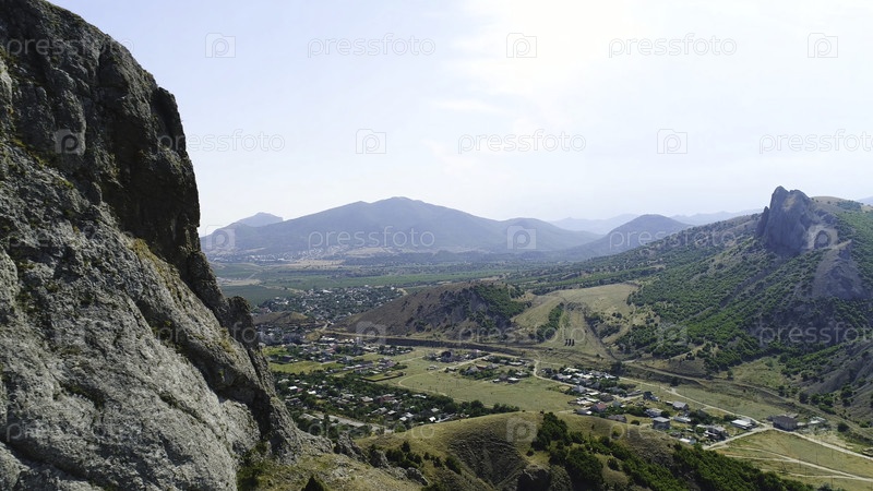 Деревня среди зеленой травы в горах в летний день.Снимок.Вид сверху живописного природного вида в солнечный день