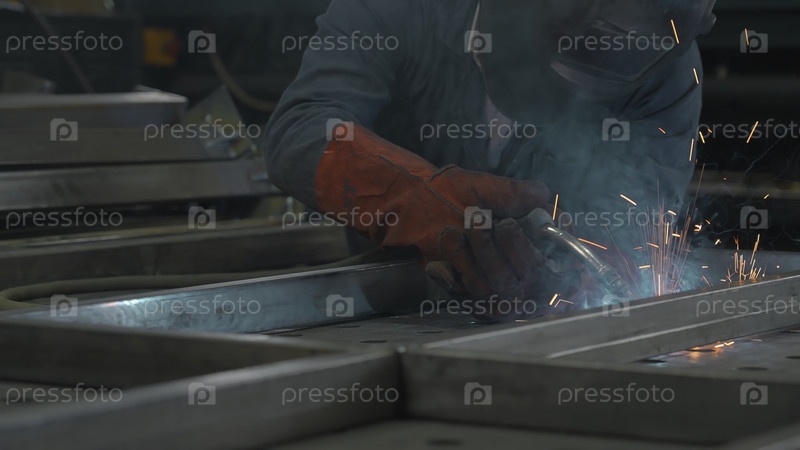 Человек в маске работает со сварочными металлическими конструкциями на фабрике.Креативный.Сварильщик в оборудовании работает на промышленном заводе.Работник по сварке и завариванию искры из металла