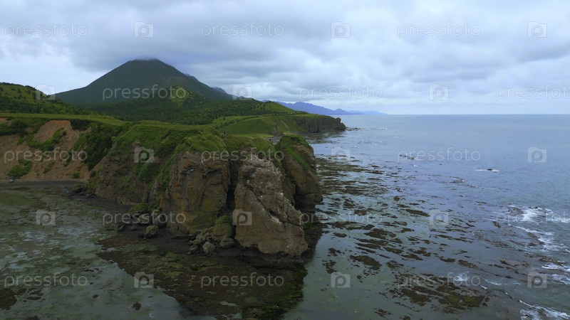 Скалистое побережье с водорослями после шторма. Клип. Сверху вид водорослей на берегу скалистого побережья в пасмурную погоду. Морские водоросли на побережье после шторма
