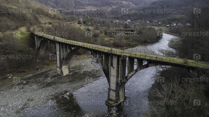 Вид с воздуха на деревню и горы, покрытые желтыми деревьями и узкой рекой, протекающей под старым мостом