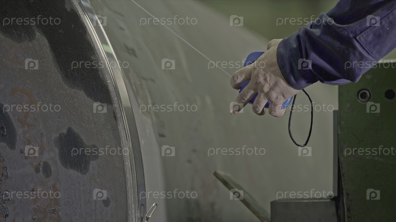 Вращающийся бетонный барабан на фабрике. застежка для запасов. рабочий измеряет вращающийся барабан на заводе. работник проверяет вращающийся механизм с помощью бетоновой катушки