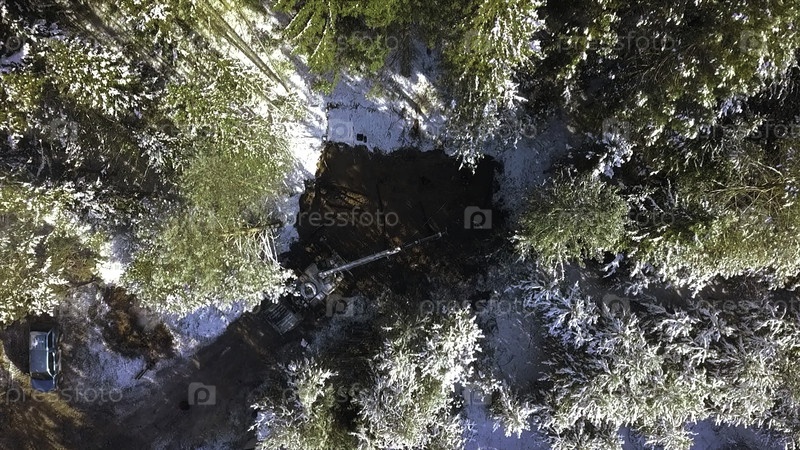 Вид сверху на стройплощадку дома в зимнем лесу. Клип. Подготовка участка для строительства загородного дома в лесу зимой. Площадь земельного участка с началом строительства загородного дома