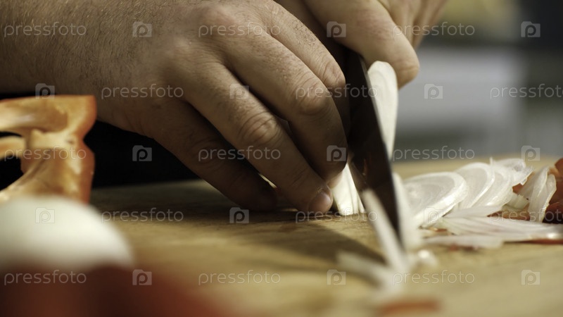 Близкий план профессионального шеф-повара, нарезающего лук. Фрагмент кадров. Режущий лук для блюда с острым ножом в руках профессионального повара ресторана