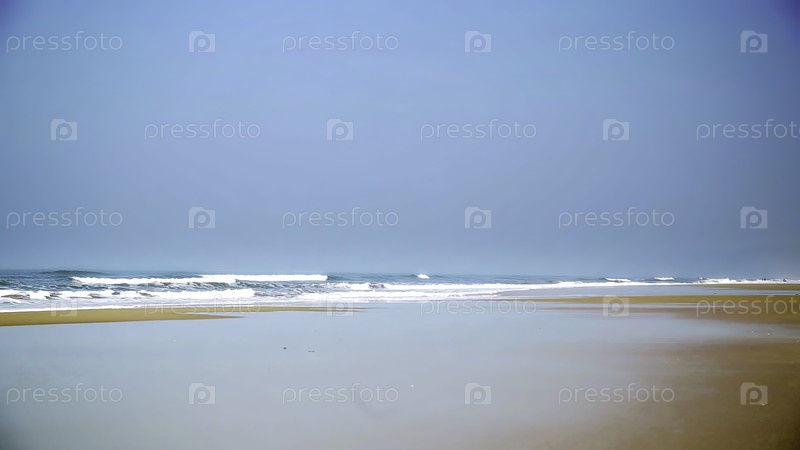 Мирный и спокойный пляжный ландшафт, демонстрирующий завораживающие волны вместе с ярко-синим небом