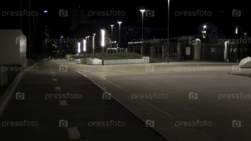 Ночной городской парк и пустой асфальтированный тротуар возле зеленой аллее.Путь в парке поздним вечером вдоль фонарей