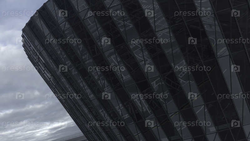 Фасад стеклянного круглого здания с отражением. Фотоаппаратные кадры. Вид сверху стеклового здания со отражением города. Стеклянный фасад современного бизнес-здания или арены