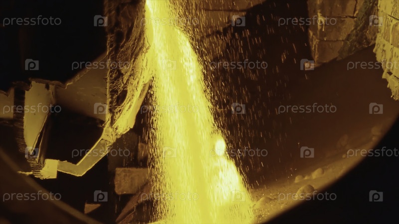 Расплавленное сырье в печи. Снимок запасов. Близкий план яркого расплавленного вещества, выливающегося по течению в промышленной пече