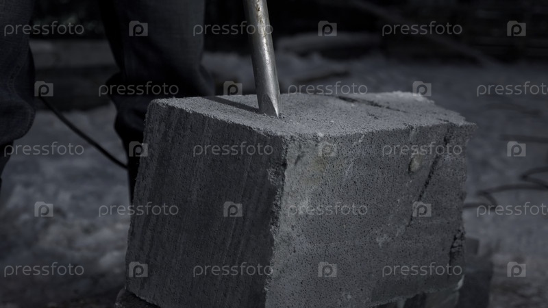 Ближайшее изображение бурения цементного блока.Клип.Промышленные работы на строительной площадке