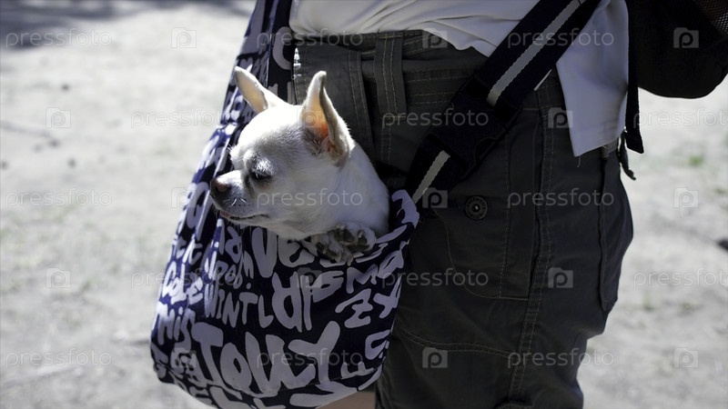 Маленькая милая собачка в темно-синей сумке путешественника, солнечный день. Клип