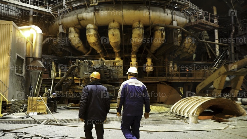 Сзади вид металлургов, гуляющих внутри горячего магазина металлического производственного завода.Концепция тяжелой промышленности, рабочие на фабрике