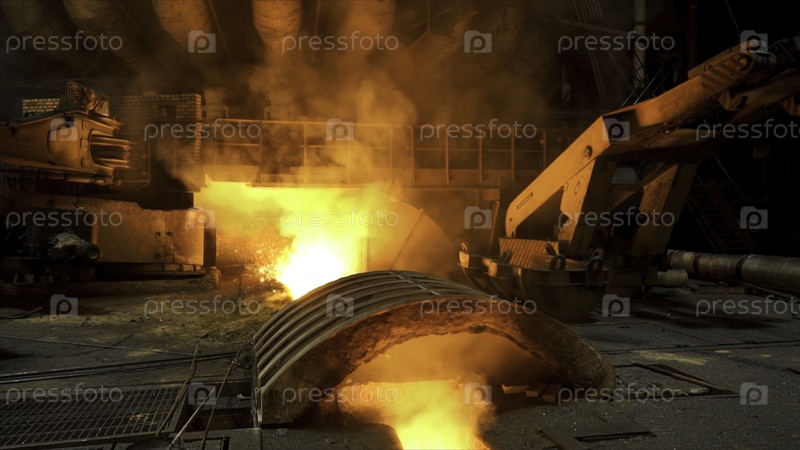 Близкий вид рабочей высокой печи на металлургическом заводе, концепция тяжелой промышленности.Промышленный ландшафт внутри горячего цеха для плавки металла