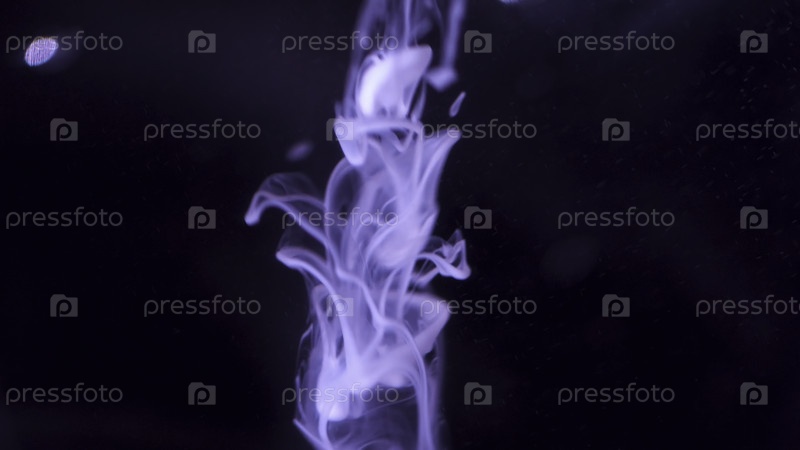 Цветные фиолетовые капли краски падают в черную воду сверху, смешиваются с водой и мягко вращаются под водой