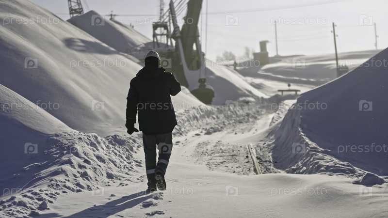 Рабочий ходит на стройплощадке в зимний день. Сценарий работы. Работник покрытого снегом карьера зимнего дня. Заснеженные тяжелые машины в карьере зимой