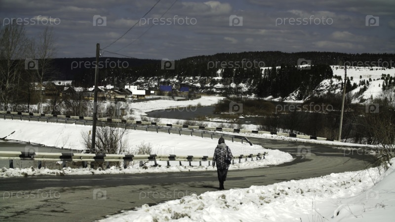 Красиво спокойная зимняя сцена с женщиной, стоящей мирно возле заснеженной сельской дороги