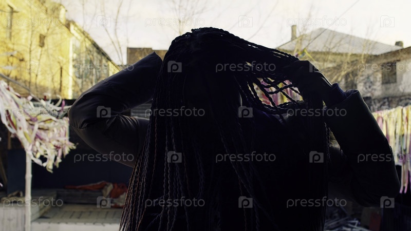 Молодая женщина, вращающаяся с красочными дредоликами. Скриншоты. Стильная женщина с дредоликами поворачивается, чтобы показать их. Красивая женщина с дредоликами на тематическом фестивале
