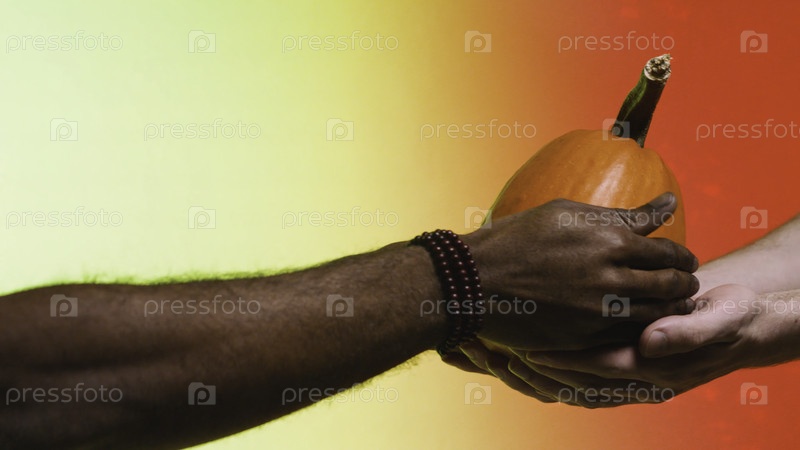 Человек отдает фрукты из рук в руки. акции. концепция торговли. чернокожий дает фрукты белому человеку