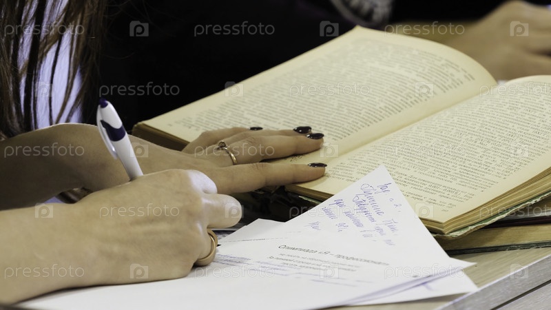 Школьница сдает экзамен на написание ответа в классе по концепции образования и грамотности
