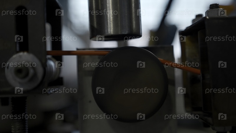 Поворачивающиеся барабаны с медными проводами на них.Креативное.Металлическая катушка, вращающаяся на машине