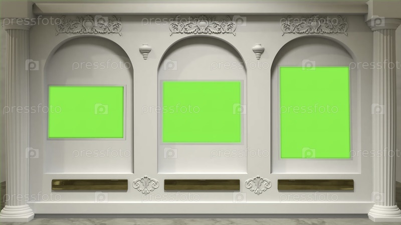Художественная галерея с дугами в стенах и пространствами chromakey вместо картин. зеленые экраны на стене музея