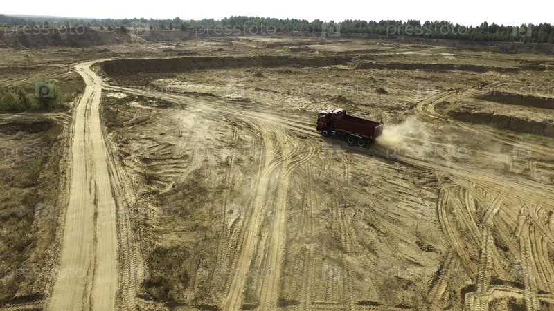 Грузовик едет по дороге песчаного карьера. Сцена. Вид сверху самосвала, движущегося по желтой грунтовой дороге в сельской местности. Большие грузовики на стройплощадке или территории карьера