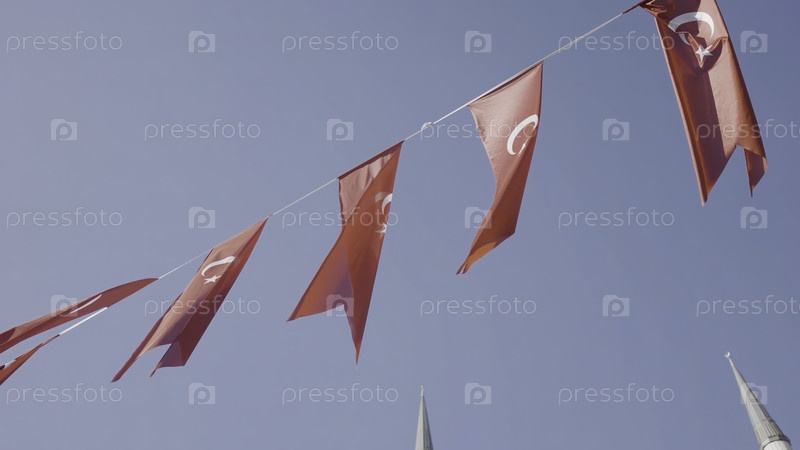 Турецкие флаги на веревке. Действие. Флаги Турции празднично повешены на веревке на фоне голубого неба. Флаги Турции красиво висят и размахивают в ветре. Турецкий праздник и патриотизм