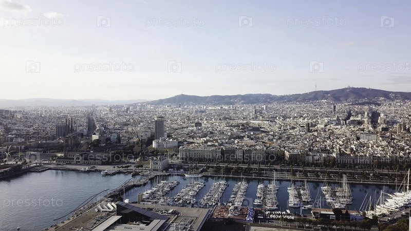 Вид с воздуха на удивительные лодки при закате солнца. Сток. Высочайший вид от дрона гавани с яхтой, моторной и парусной шлюпкой. Прекрасный порт