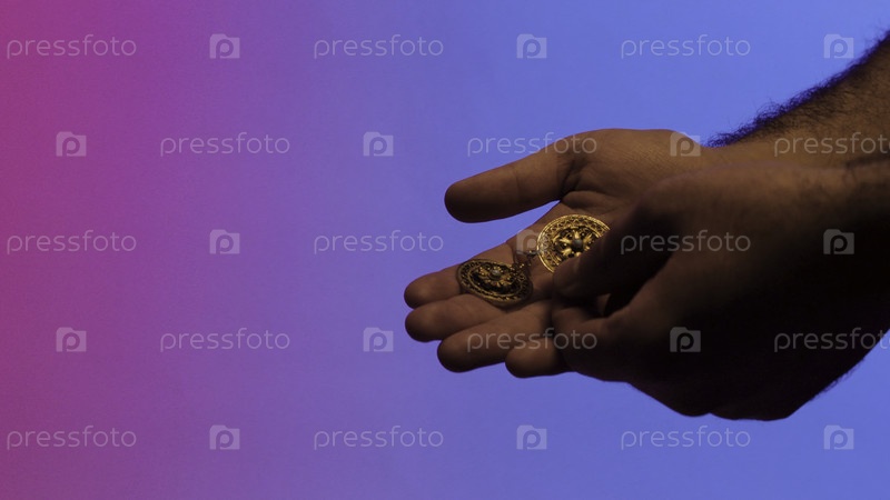 Женские руки мехенди дают золотые, восточные винтажные ручные серьги на красочном фоне, концепция продажи античных ювелирных изделий
