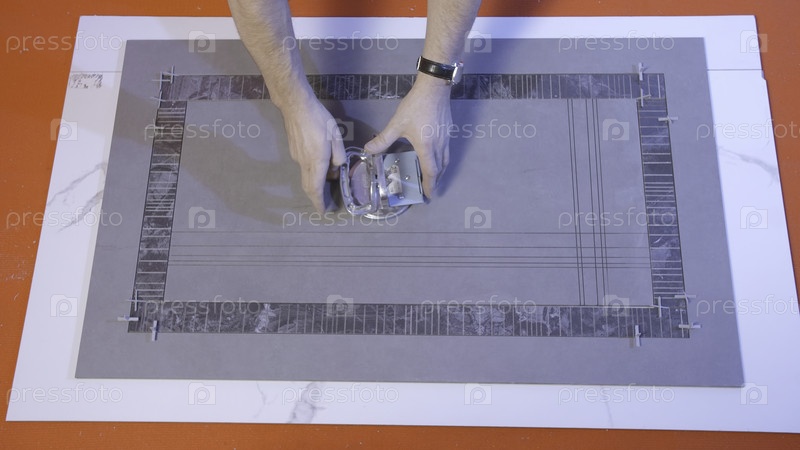 Работник соединяет рисунок плитки.Креативный.Человек связывает детали квадратных досок.Человек соединяет рисунки досок и плит