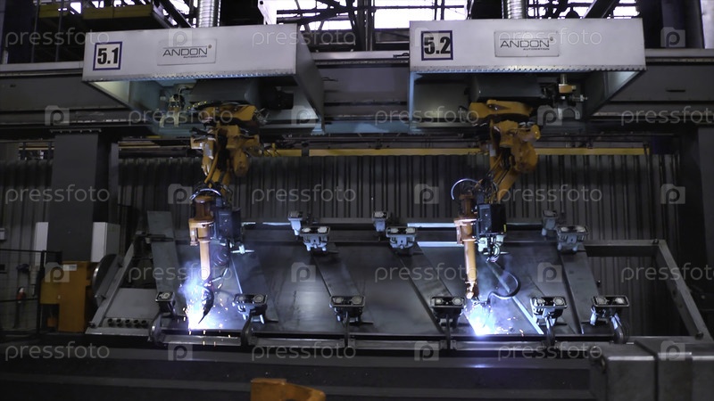 Москва, Россия - сентябрь, 2018: Движение роботов-сварщиков на автозаводе.Сцена.Движение робота при сварке искрами на заводе автомобильных запчастей