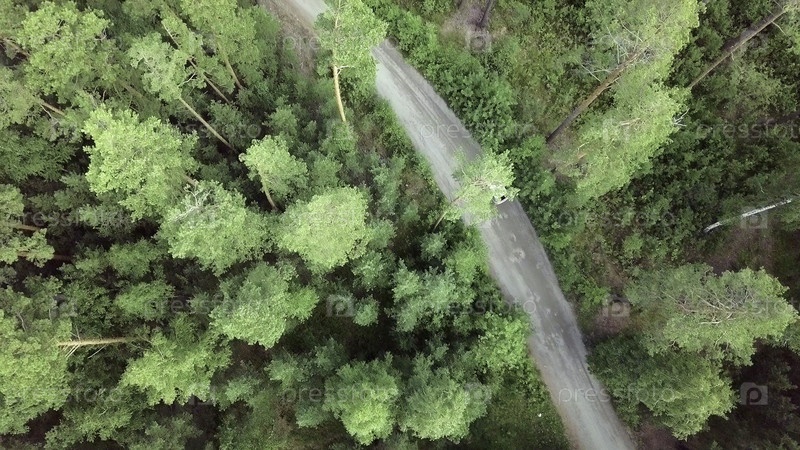 Захватывающий взгляд с воздуха, показывающий автомобиль, едущий через пышный и яркий зеленый лес