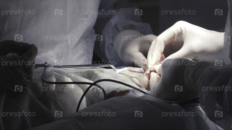 Близкая деталь операции на мужских половых органах с профессиональным оборудованием.Действие.Хирурги в стерильных костюмах выполняют медицинскую процедуру, процесс простатэктомии