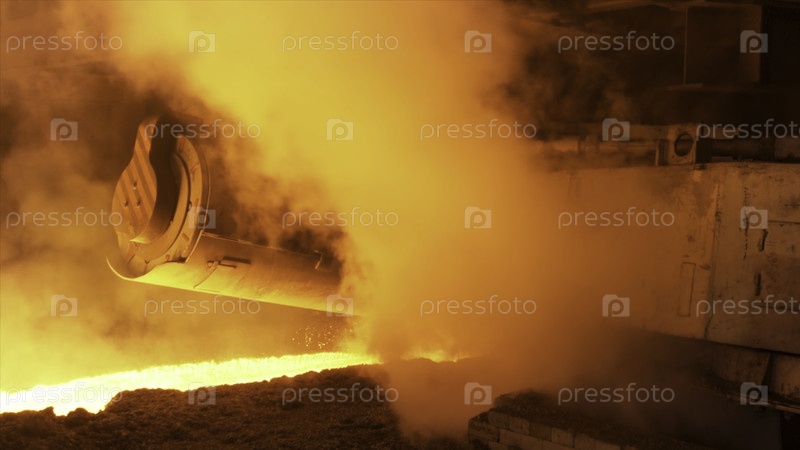 Производство горячей стали на сталелитейном заводе, концепция металлургии. Снимок запасов. Горячая мастерская с текущей расплавленной сталью в шлейфе