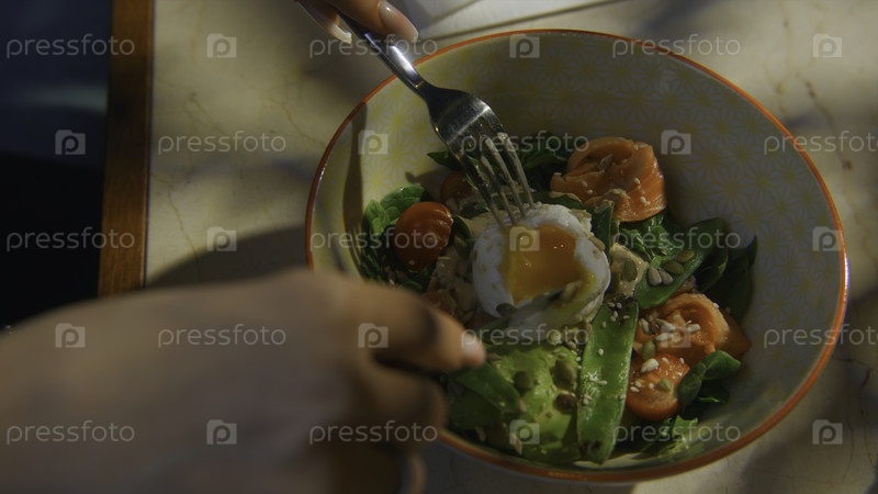 Ближайший снимок женщины, разрезающей яйцо в салат. скриншоты. вкусный ресторанный салат с яичницей. Instagram завтрак или обед с жидким яйцом на зеленом сочным салате