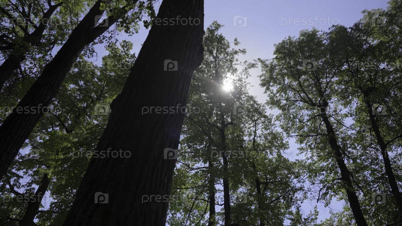 Солнечный свет фильтруется через деревья в красивой и пышной зеленой лесной среде